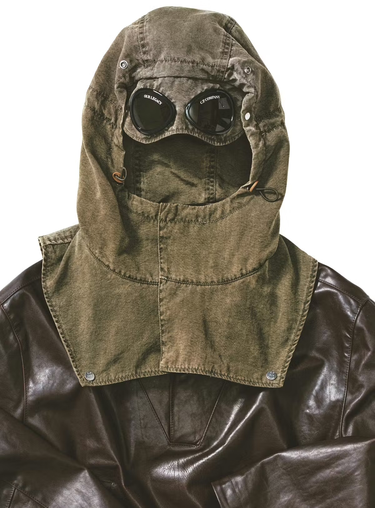 «В конце 90-х C.P. Company стал очень минималистичным, практически в стиле Жиль Сандер», – говорит Халлин. «Для коллекций бренда того периода характерны строгие образы с выразительными кожаными пальто, которые также присутствуют и в наших коллекциях». Этот период оказался для двух брендов особенно вдохновляющим и побудил к созданию в рамках коллаборации собственного прочтения кожаного пальто. В результате в коллаборации появился анорак свободного кроя из кожи цвета темного шоколада со съемным капюшоном из ткани с эффектом застиранности. Культовые линзы бренда, расположенные на капюшоне отмечены логотипами двух брендов — по одному на каждой линзе.