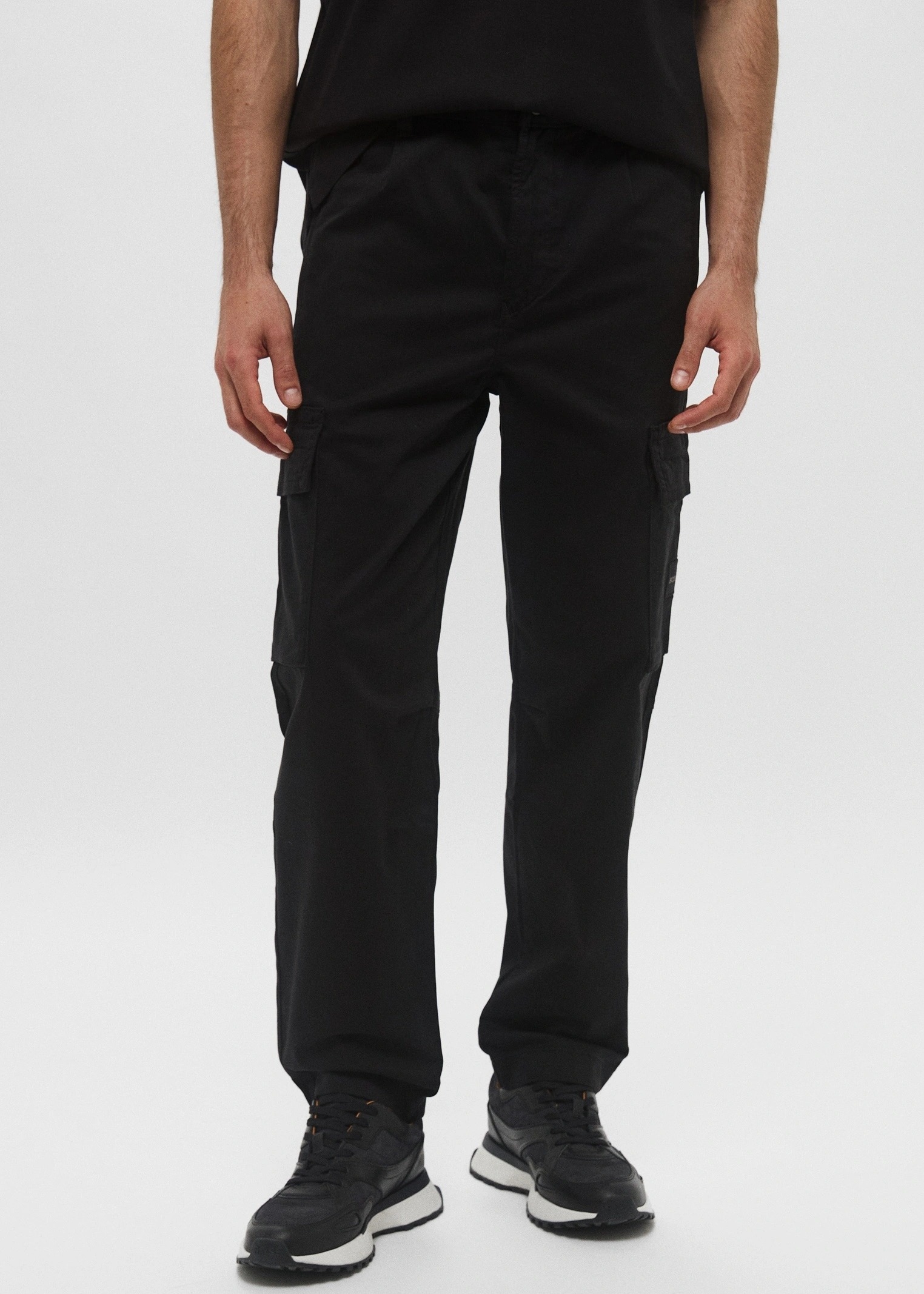 Черные карго с не слишком объемными карманами и кроем слим фит. Черно-серый логотип на кармане выделяется не слишком сильно, так что штаны можно вполне зачислить в базовые. Состав: 97% хлопка и 3% эластана. Размеры от 30 до 40, длина 32 и 34, цена 20 990 рублей. Купить можно здесь.