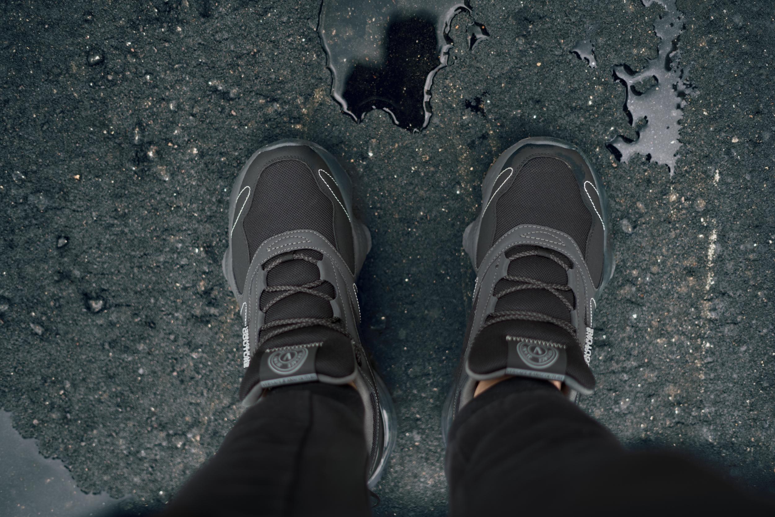 кроссовок выглядит очень эффектно и заметно не только благодаря объему, но и прозрачной пяточной части, в которой видна система амортизации на манер найковской воздушной подушки. Высота подошвы в мысочной части 1,5 сантиметра и 4,5 в пяточной зоне. Протектор подошвы может похвастаться интересным волнообразным рисунком, но без объемных элементов, так что суперцепкости от него точно ждать не стоит. Зато с такой подошвой не страшны даже глубокие лужи.