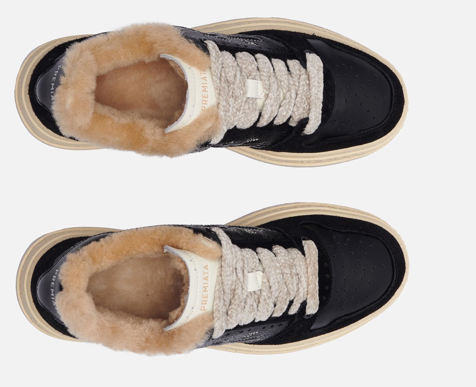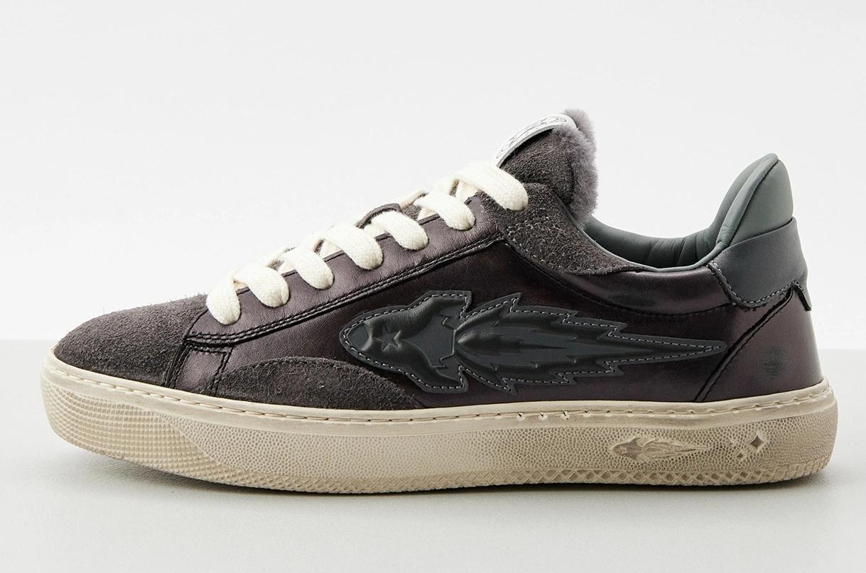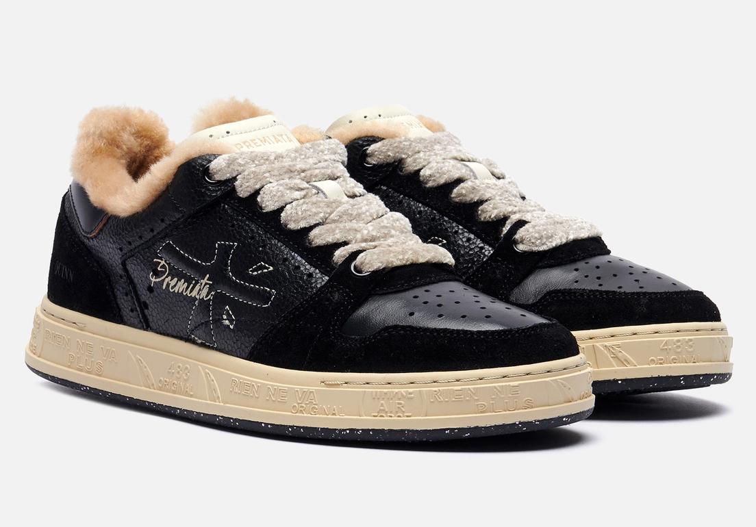 Прямо-таки новогодняя модель от Premiata. А всего-то надо было сделать вставку из блестящей фактурной кожи и добавить толстые шнурки с блеском. Ну и конечно же мех, который выглядывает из кроссовок. Размеры от 35 до 39, цена 38 790 рублей. Купить можно здесь.