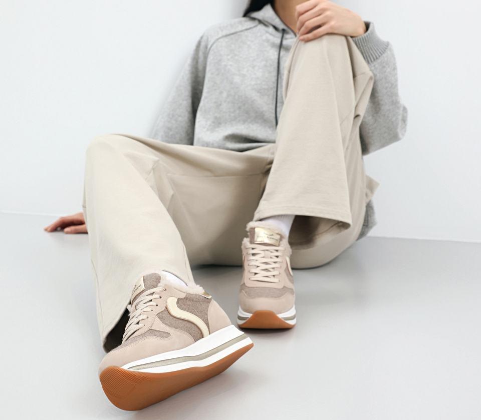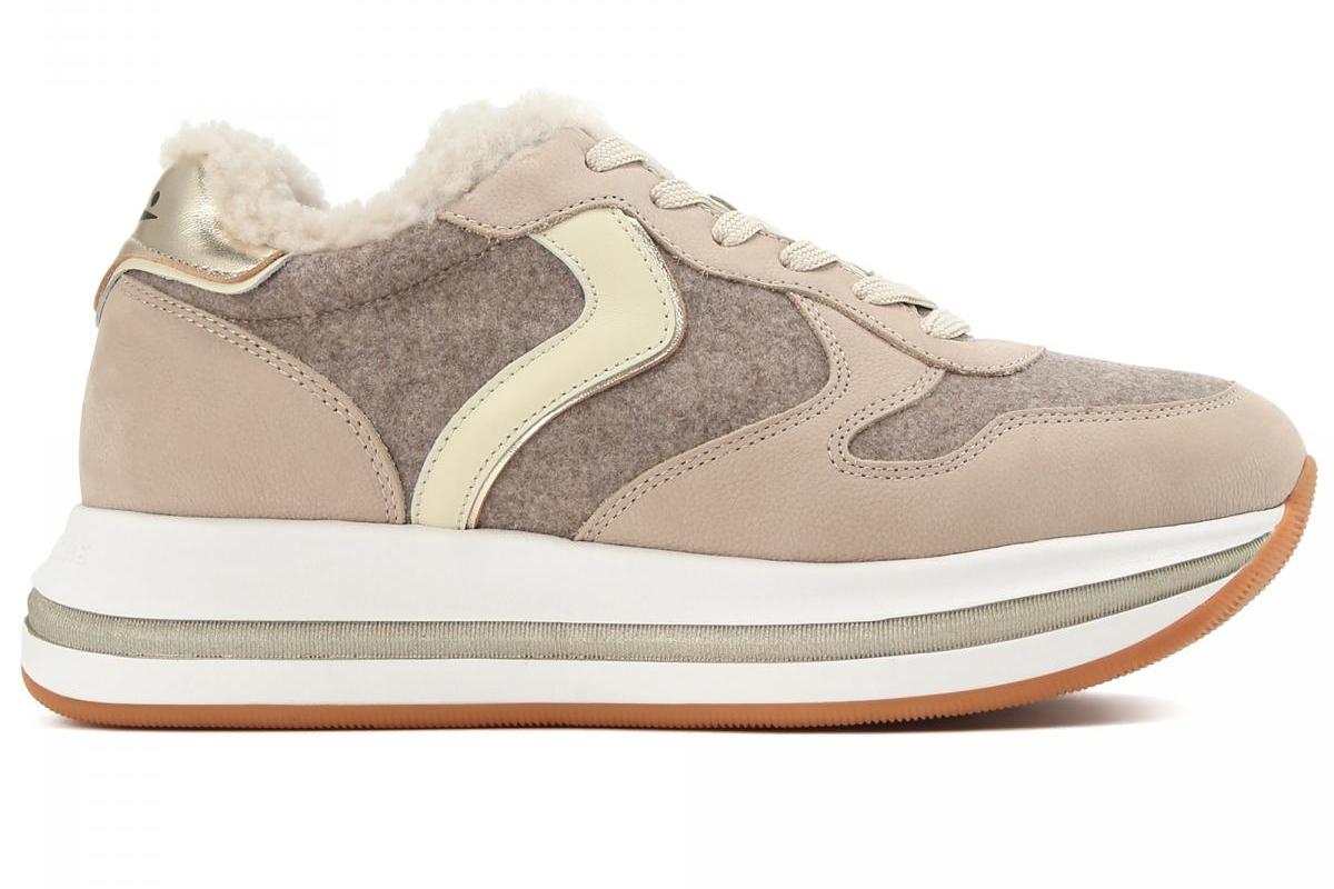 Еще одна модель на высокой подошве от итальянского бренда Voile Blanche. Модель в неброской бежевой цветовой гамме с золотистым задником и золотистым кожаным патчем на язычке. Размеры от 36 до 41, цена 26 690 рублей. Купить можно здесь.